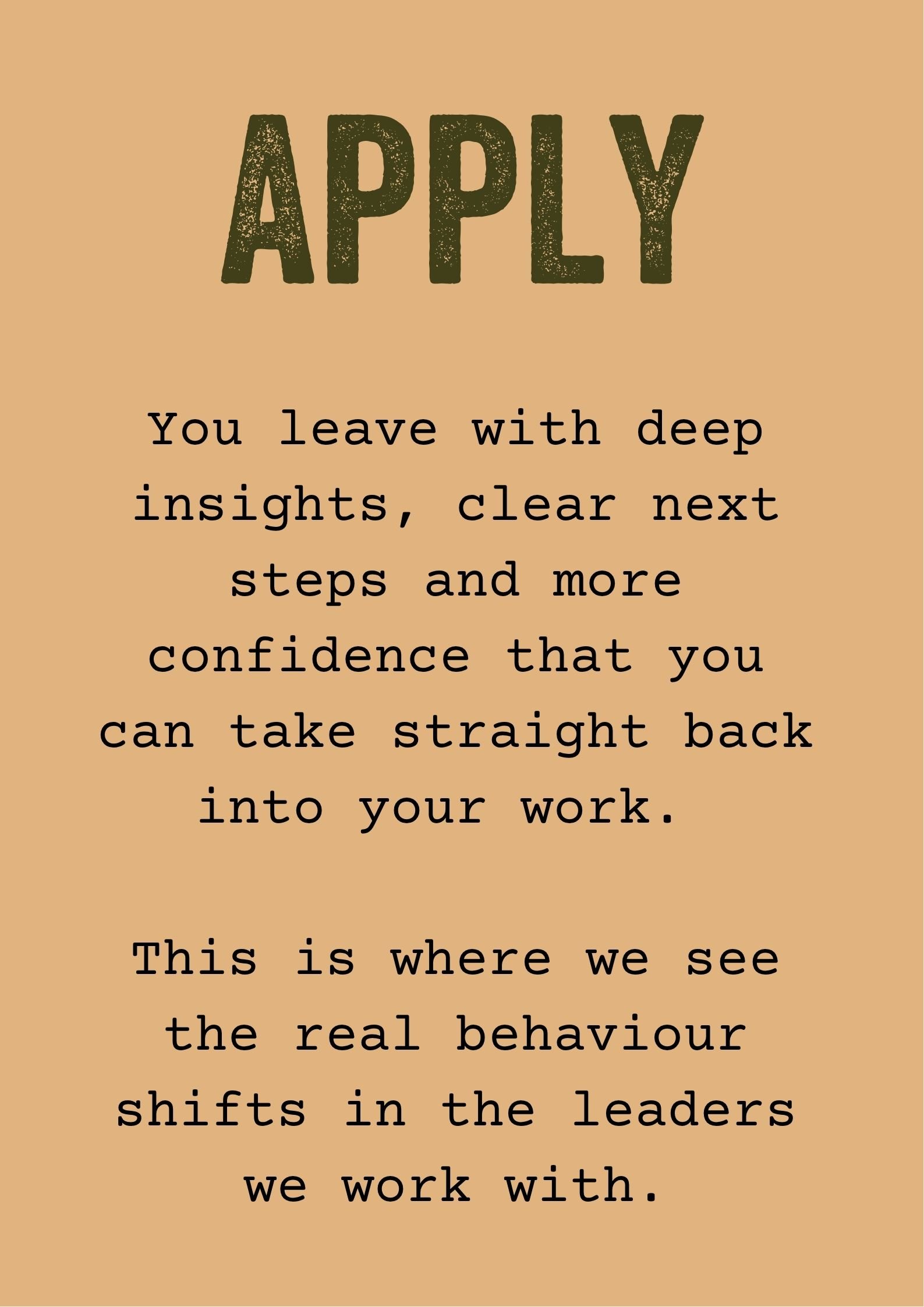 You practise real skills in a space away from the day-to-day, then take the learning straight back into your work.