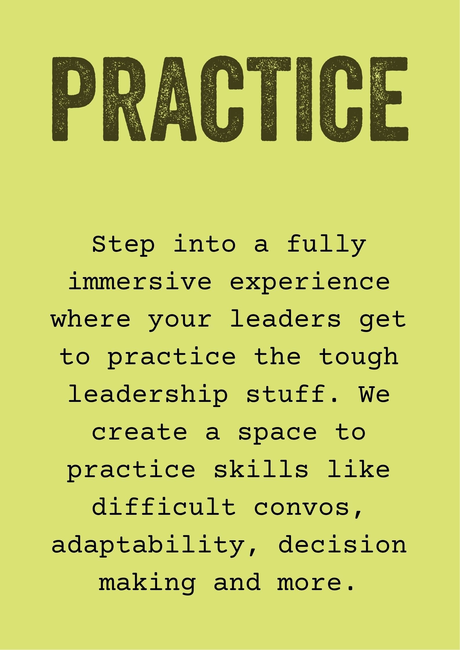 We run immersive, story-based games and adventures for leaders and teams. This creates an environment for leaders to practice core leadership skills without the real world stakes.